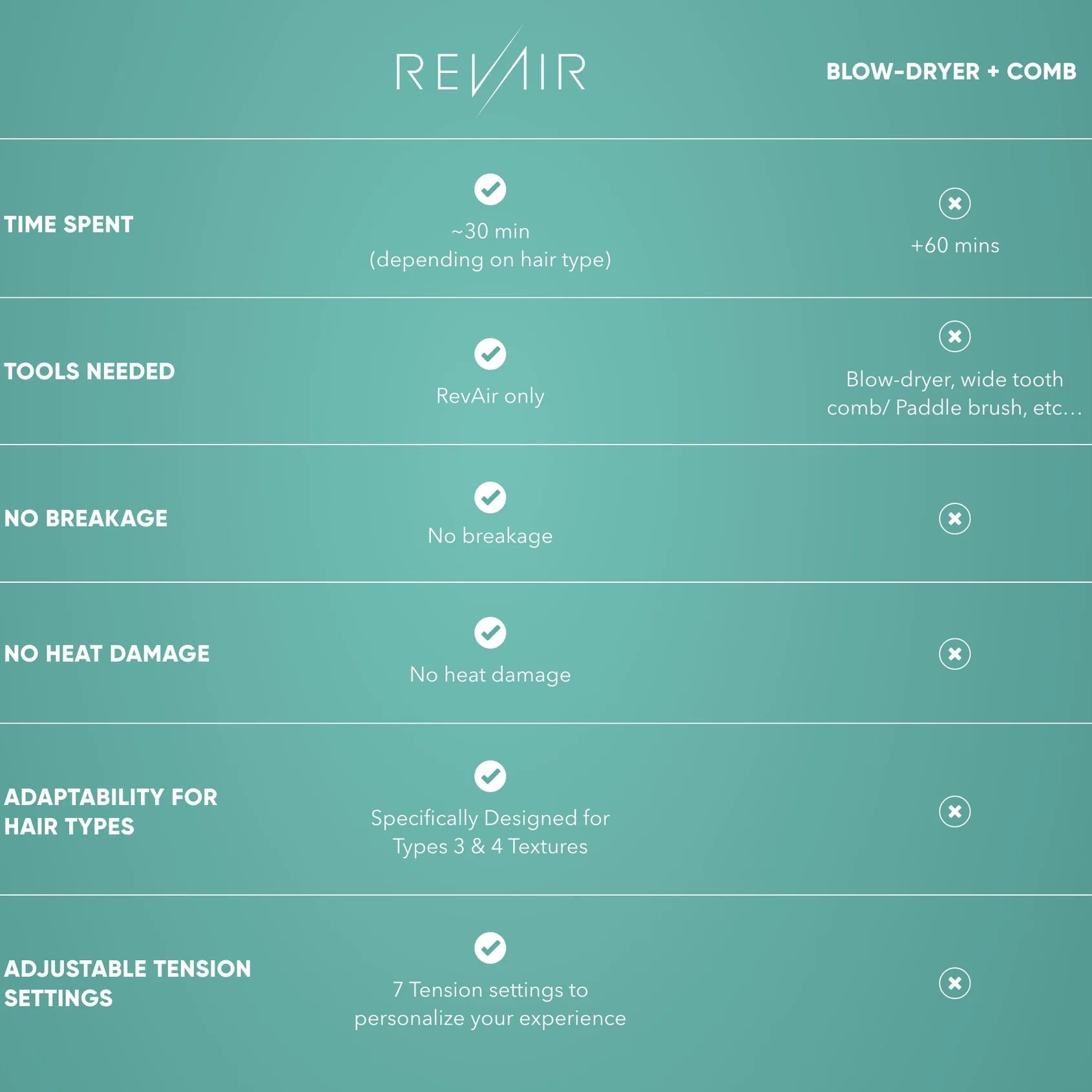 RevAir literally means “Reverse Air” – our revolutionary technology harnesses gentle vacuum suction to carefully draw the moisture from your follicles in the actual direction of growth. So instead of just blowing hot air (and causing damage and breakage) you can smooth, stretch AND dry, all in one easy step.